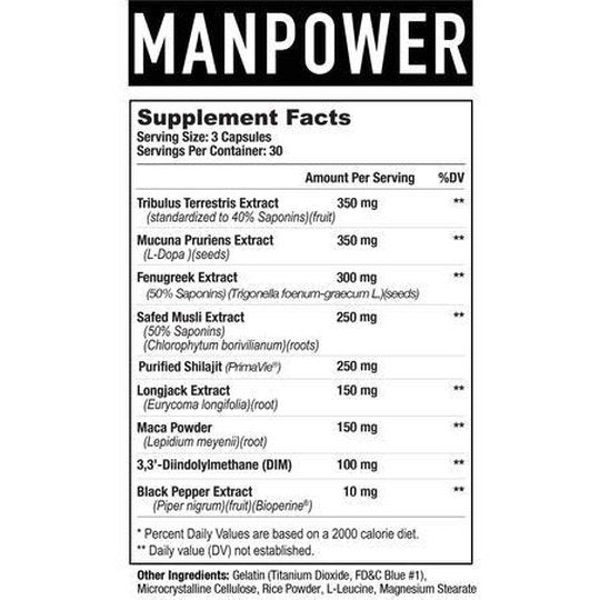 Man Power is a natural testosterone booster specifically formulated for the hardest workers in the gym who want to optimize their hormone levels. Unlike other testosterone boosters, Man Power provides a fully transparent label and utilizes several patented ingredients, including Primavie® and Bioperine®.
